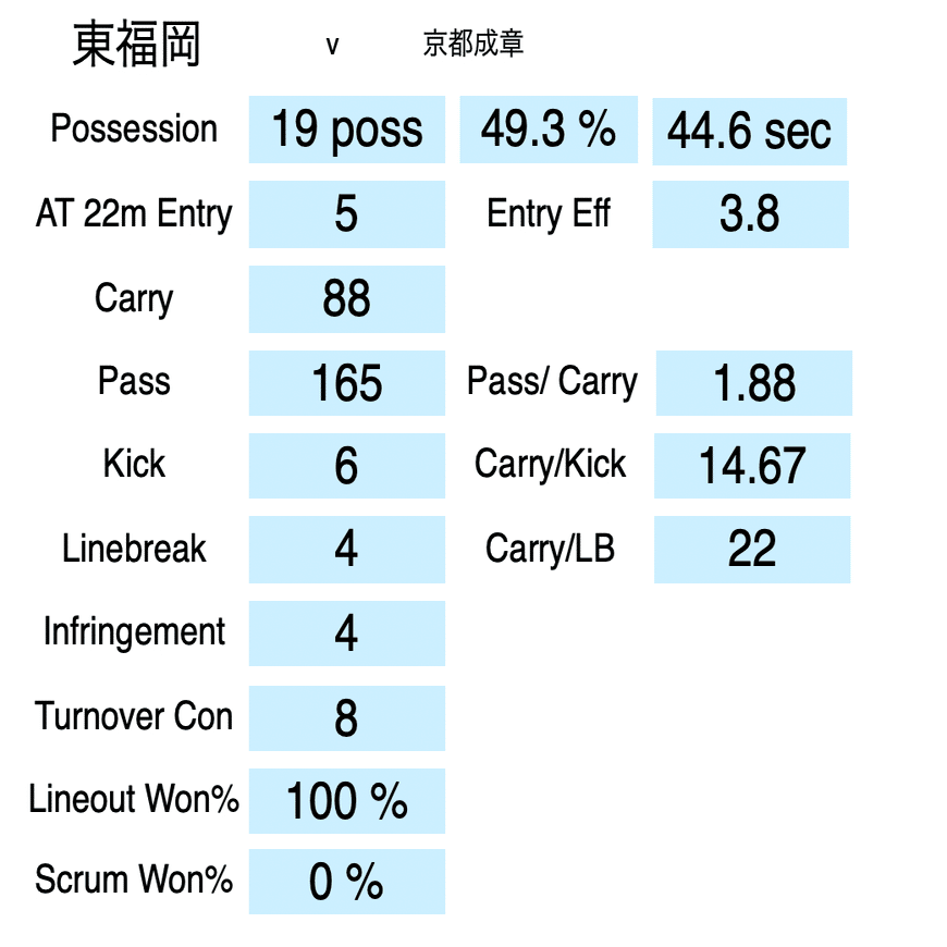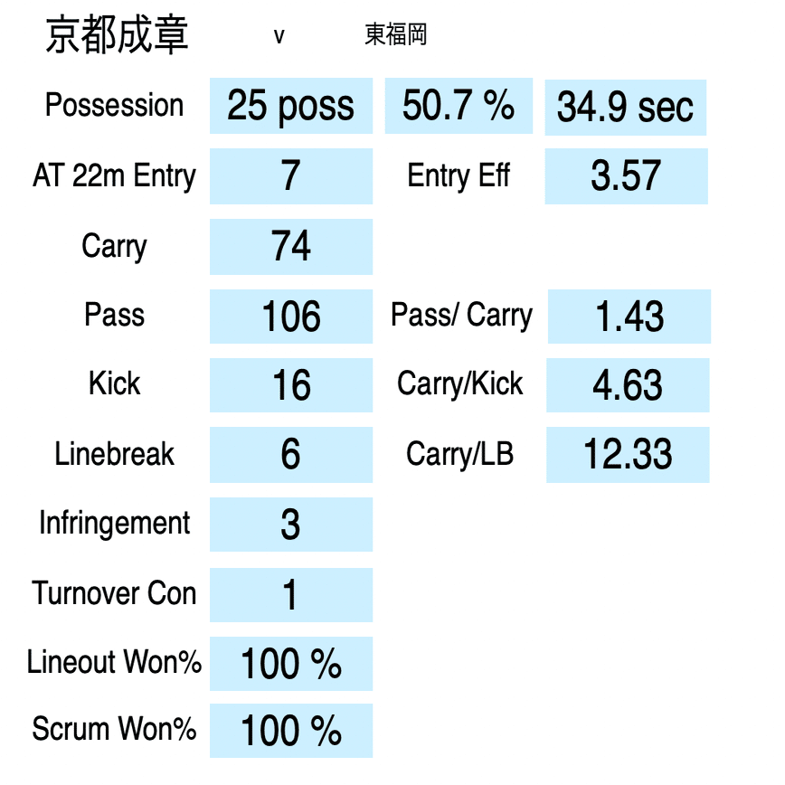 このような回数になった要因として、わかりやすい要素として「ポゼッション一回あたりの平均継続時間が長い」ということが挙げられます。京都成章の数値も大きかったですが、東福岡は1つのポゼッションあたり44.9秒と、大学やリーグワンの倍近い数値となっています。キックの回数が少ないことで一つ一つのポゼッションが長くなり、全体としてポゼッションの回数が減った、ということが考えられます。