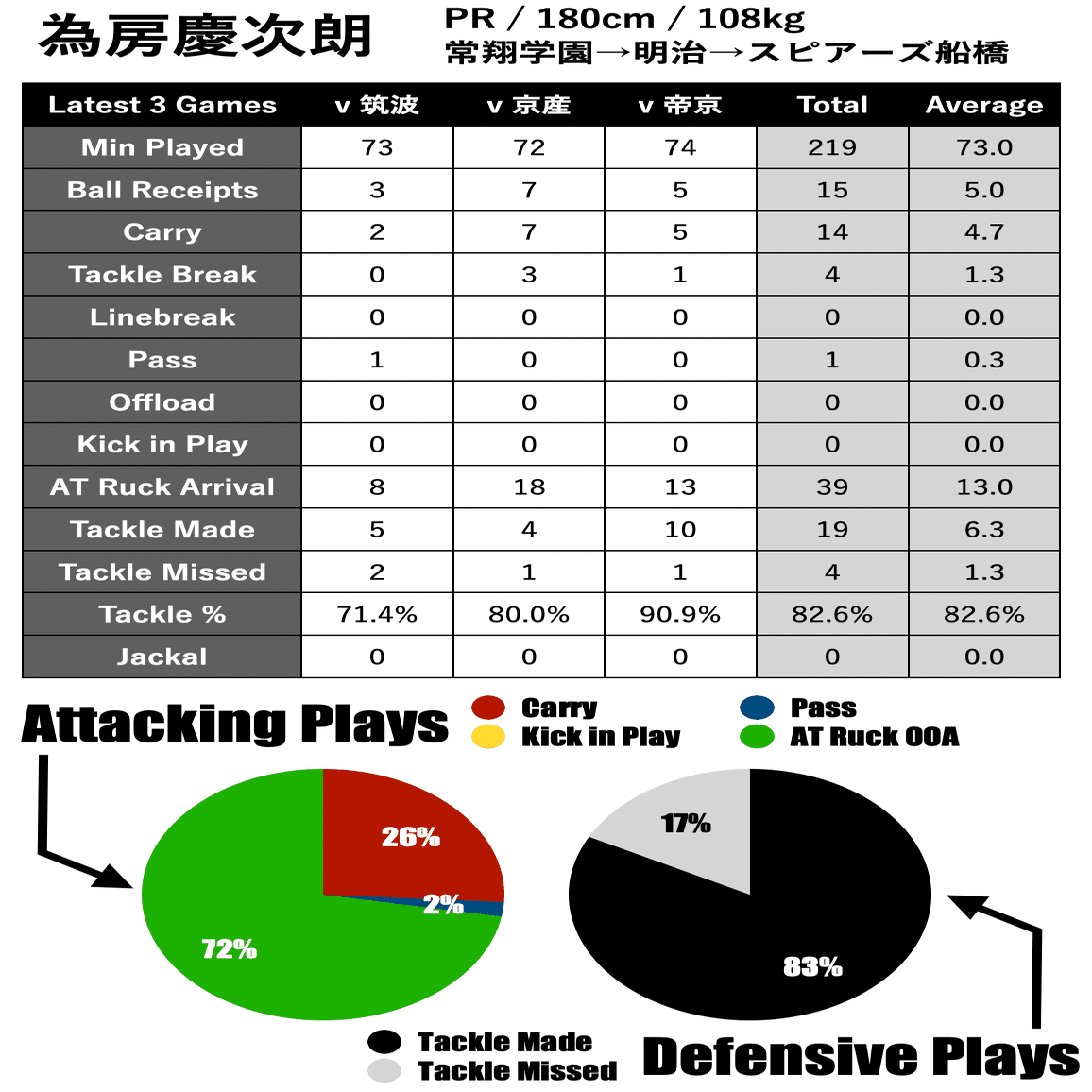 為房選手は明治の右PRで、試合全体の9割近い時間をプレーする堅実な選手であるということができるかと思います
