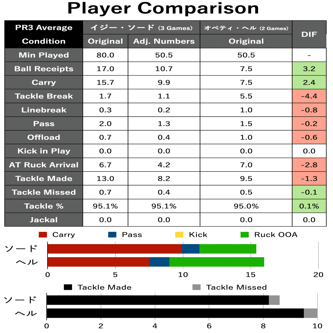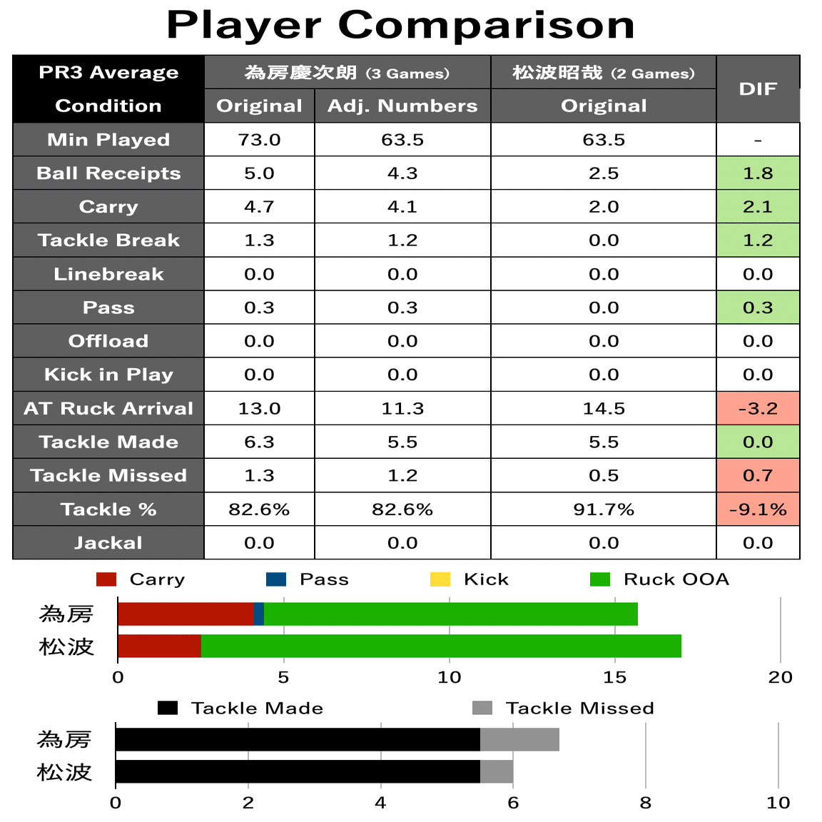 アタックフローに直接関わる部分となるキャリーやパスの部分では為房選手の方が単純計算では多いプレー回数を示しており、一方でディフェンスに関わる水準の部分では松波選手がプロとしての水準を見せているように思います
