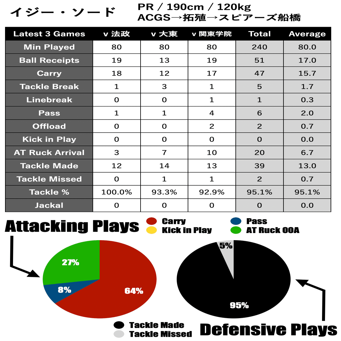 ソード選手は恵まれた体格とチームのアタック傾向からボールキャリーを多く求められる動きをしていました
