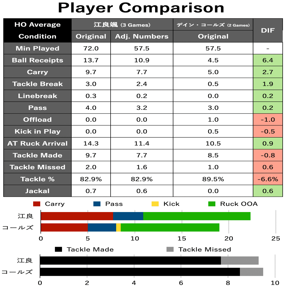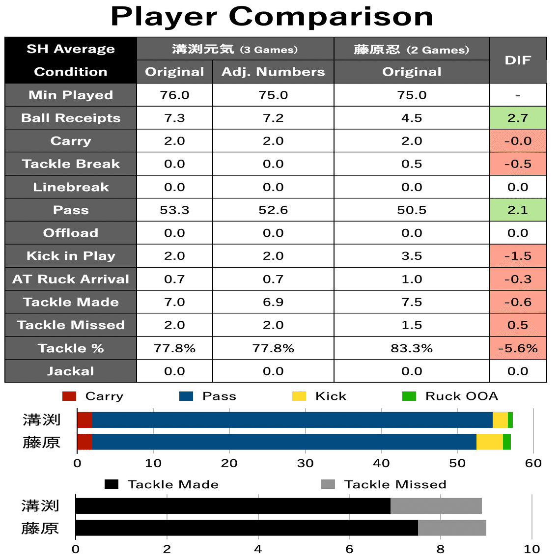 ※Adj. Numbers:大学生の三試合のスタッツの平均値について、大学生側の出場時間とリーグワン側の選手の出場時間とを比べて数値を補正したもの