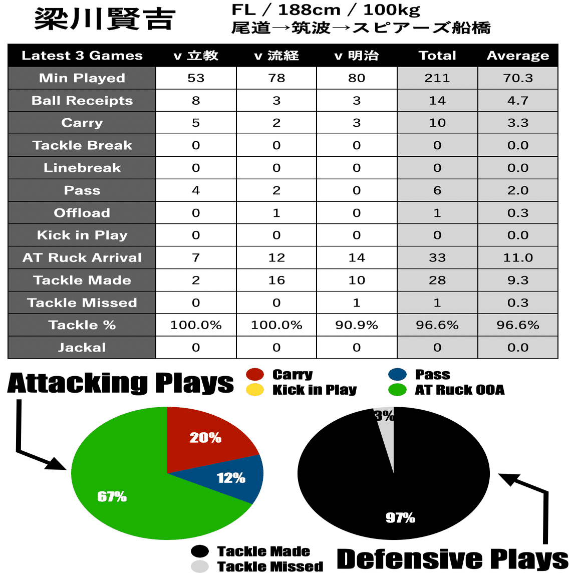 - 大学生の分析は直近の三試合を対象とし、リーグワン側の選手に関しては「比較をするポジションとして出場している直近の二試合」を対象とする