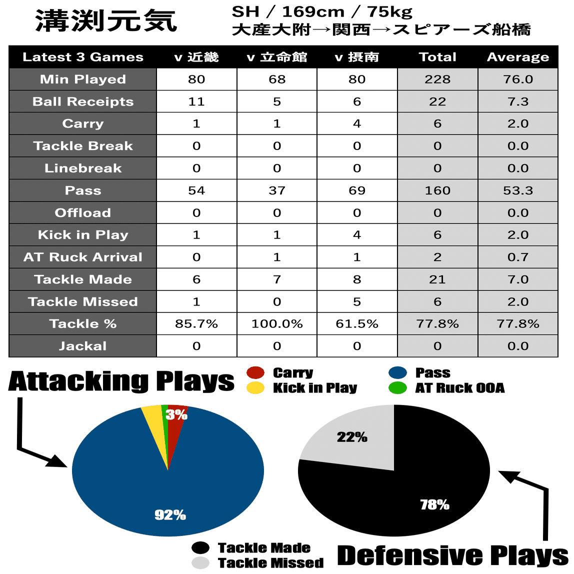 溝渕選手は良いアタック感を持ったSHで、パスをメインにチームに勢いをもたらし、ゲームを動かす選手です