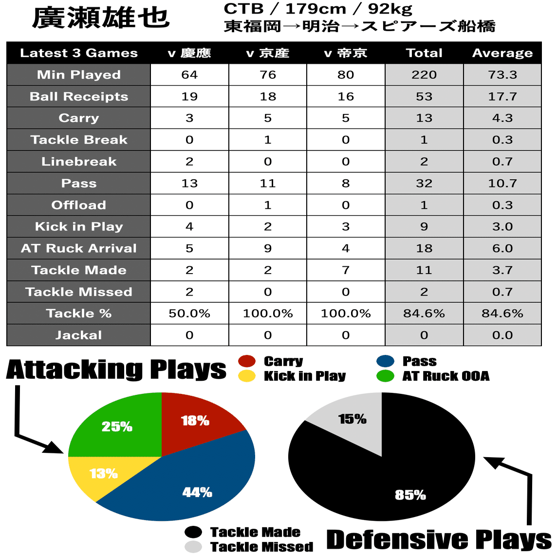 現時点ではBK3の選手はアタック時はエッジに張ってボールを待っていることが多く、明治の池戸選手のように積極的にラックからボールをもらいにいくような雰囲気ではないので、廣瀬選手の相対的なボールタッチは増えていくのではないかと思っています