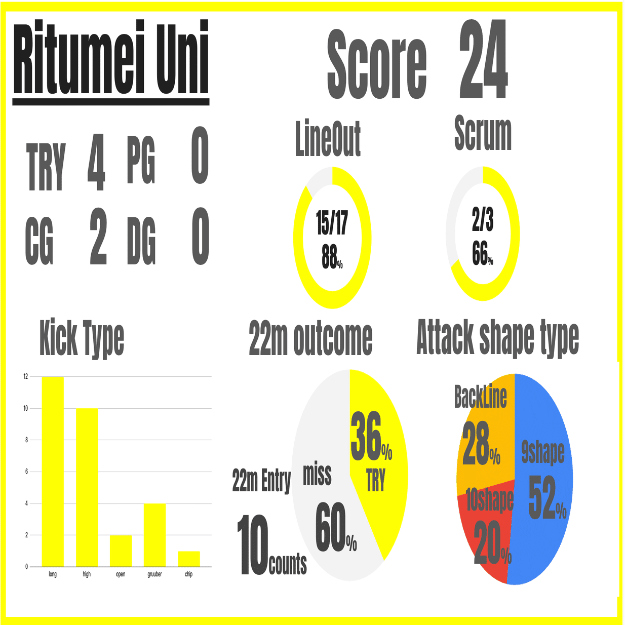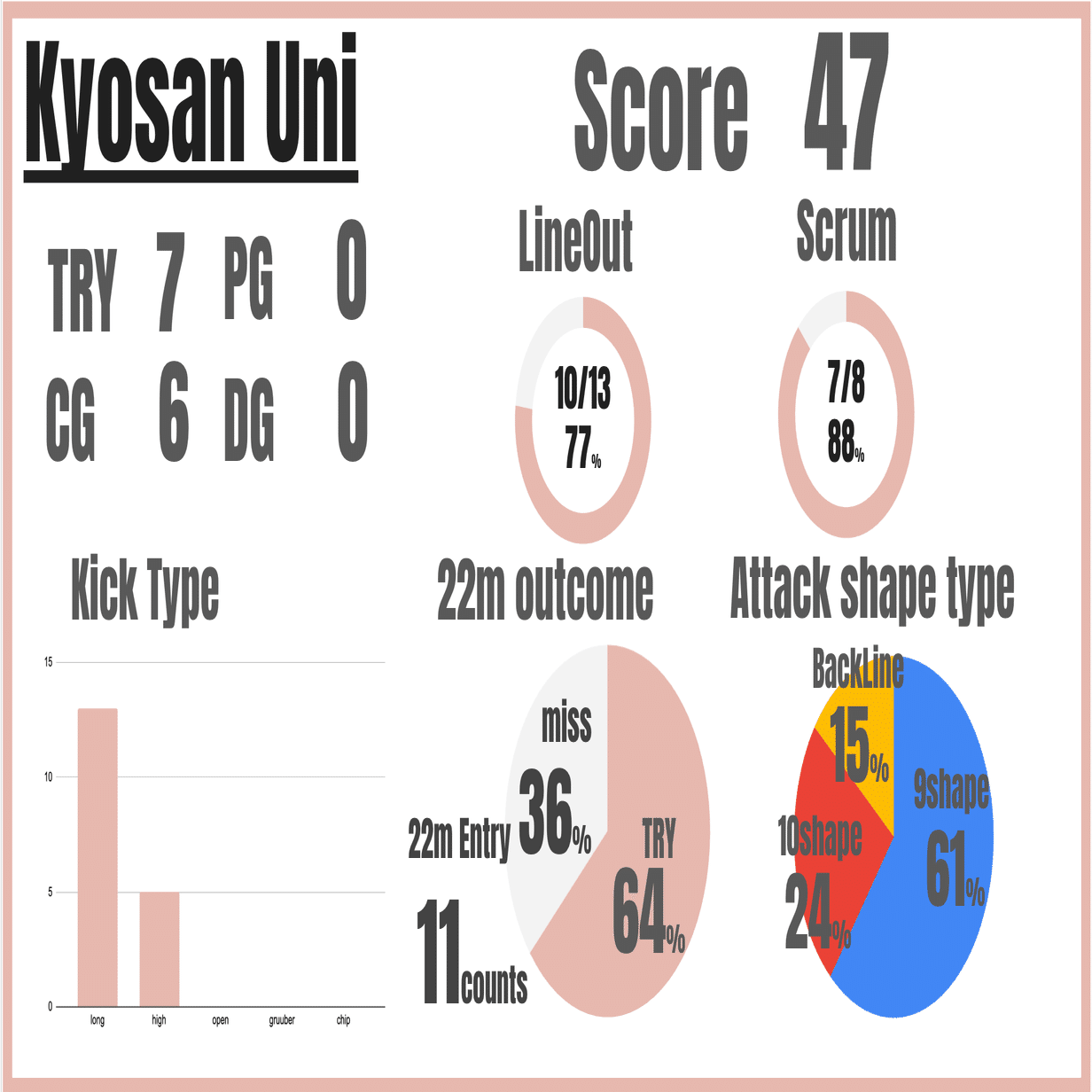 最も勝負を分けたのは、互いに10回、11回とあった「敵陣22mエリア内の決定率」でした。立命館は敵陣深くでポゼッションを持ちながら、自分たちの少ないミスを京産大に取り切られるなど、ゴール前での精度の差が敗因となりました。 アタックスタイルにおいては、京産大がFW中心の9シェイプに重きを置くのに対し、立命館が3割近くをバックラインアタックに割いていることは、「外側にチャンスメイクを求める」立命館のプランアタックを象徴しています。