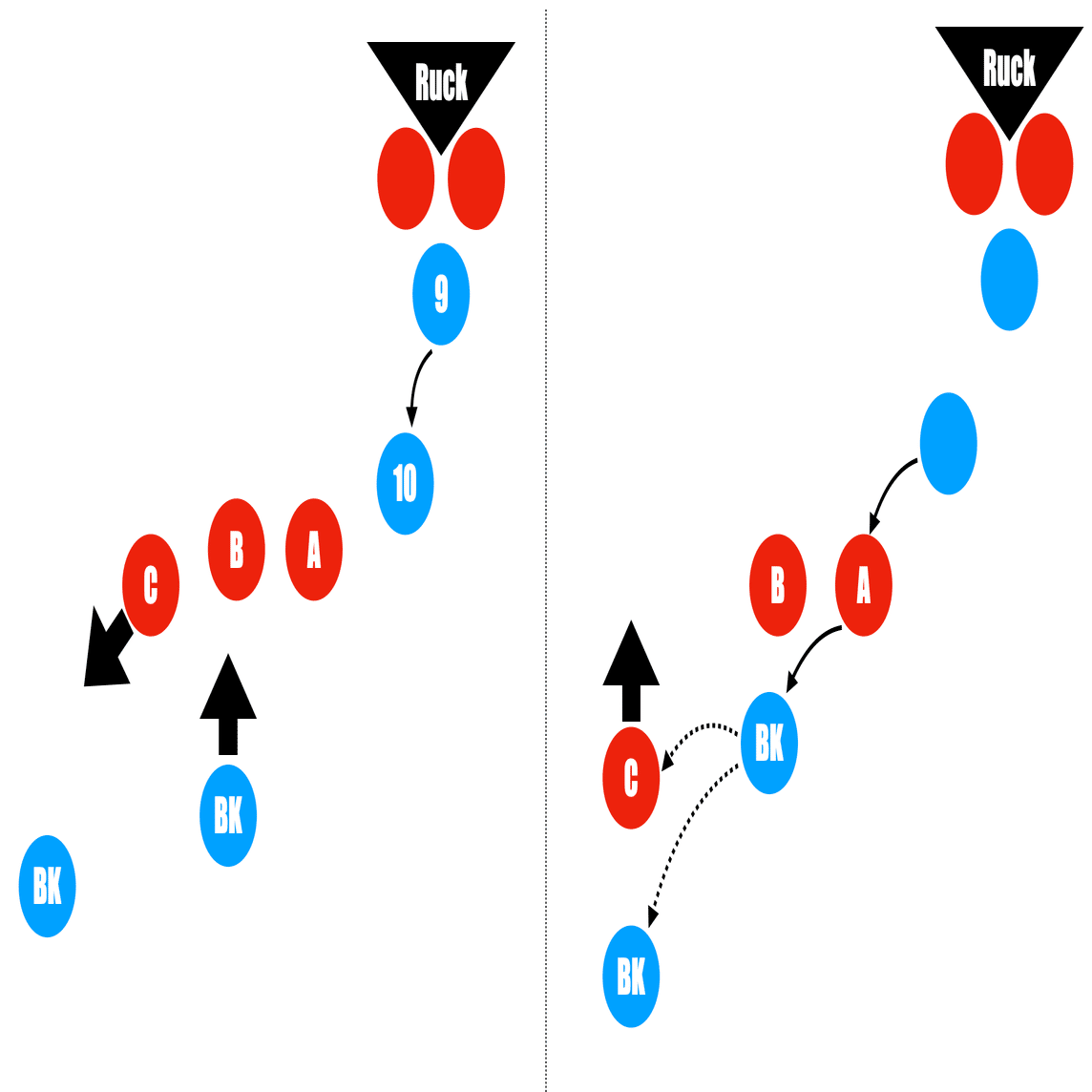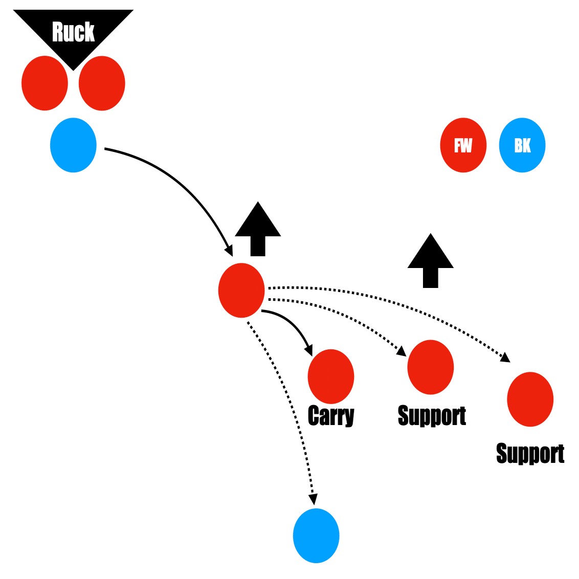 BKの絡んだアタックとしてはかなりシンプルで、BK内でもほとんどボールを動かさずにFWのポッドを繋ぐような役割に徹していたようにも見えました