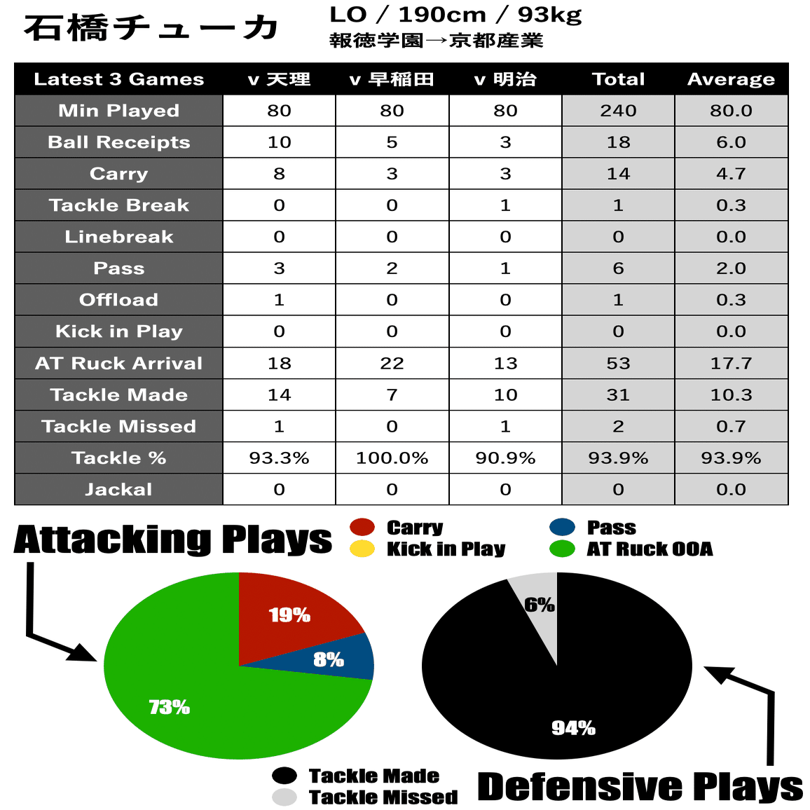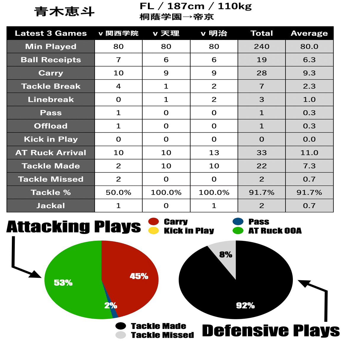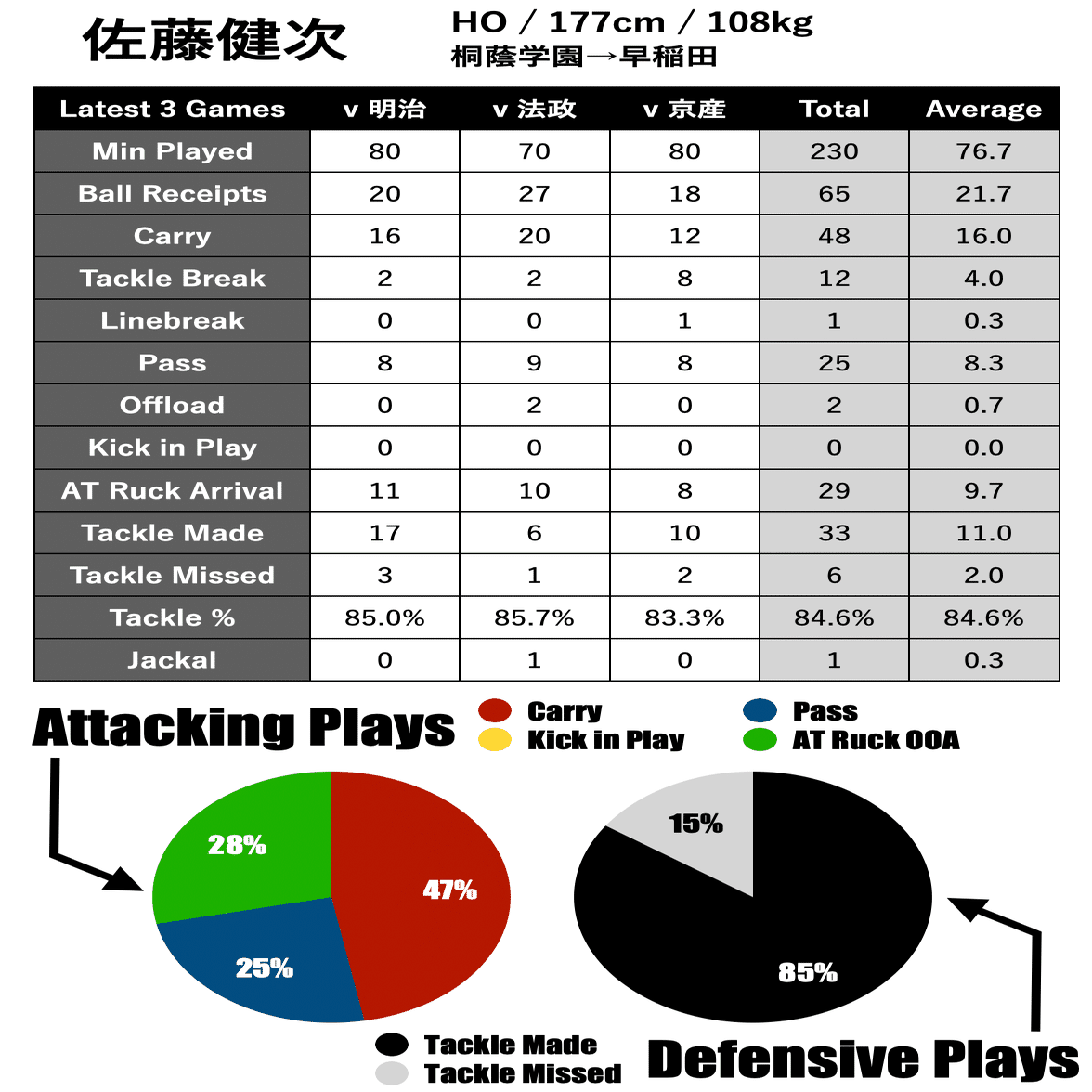 アタック面で言うとボールタッチの多くがキャリーとなっている一方でHOの選手としてはパスの比率も高く、ティップパスやスイベルパスといった「自身がキャリーするように見せかけて横・後ろの選手にパスをする」のようなスキルが大学レベルでもトップのスキル水準を誇っています