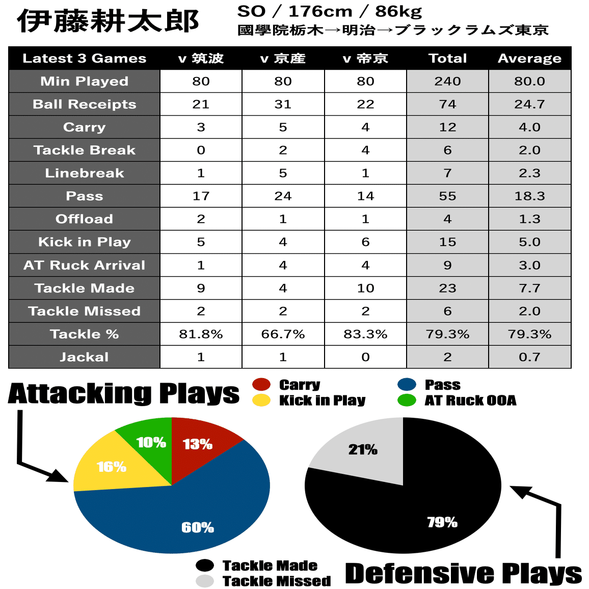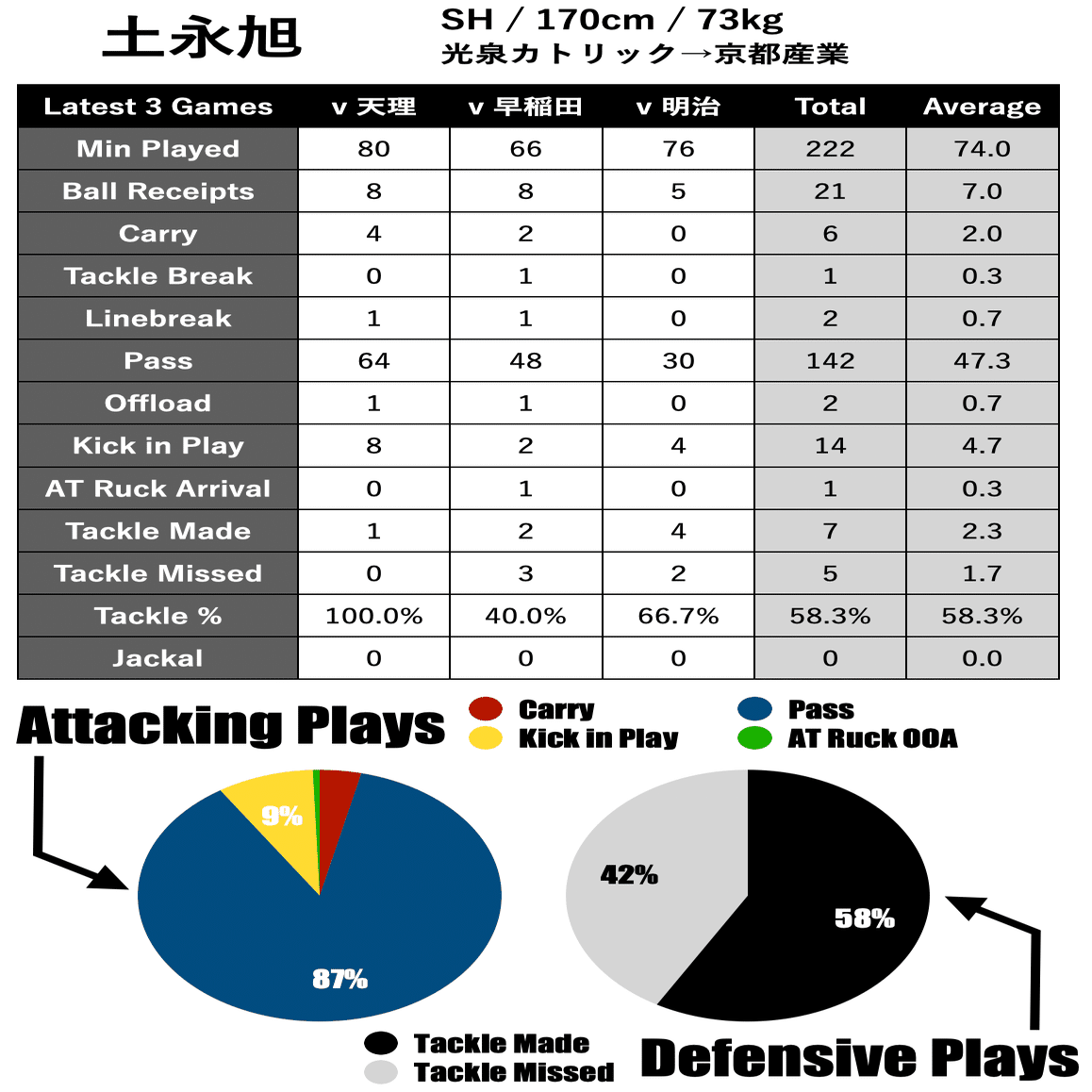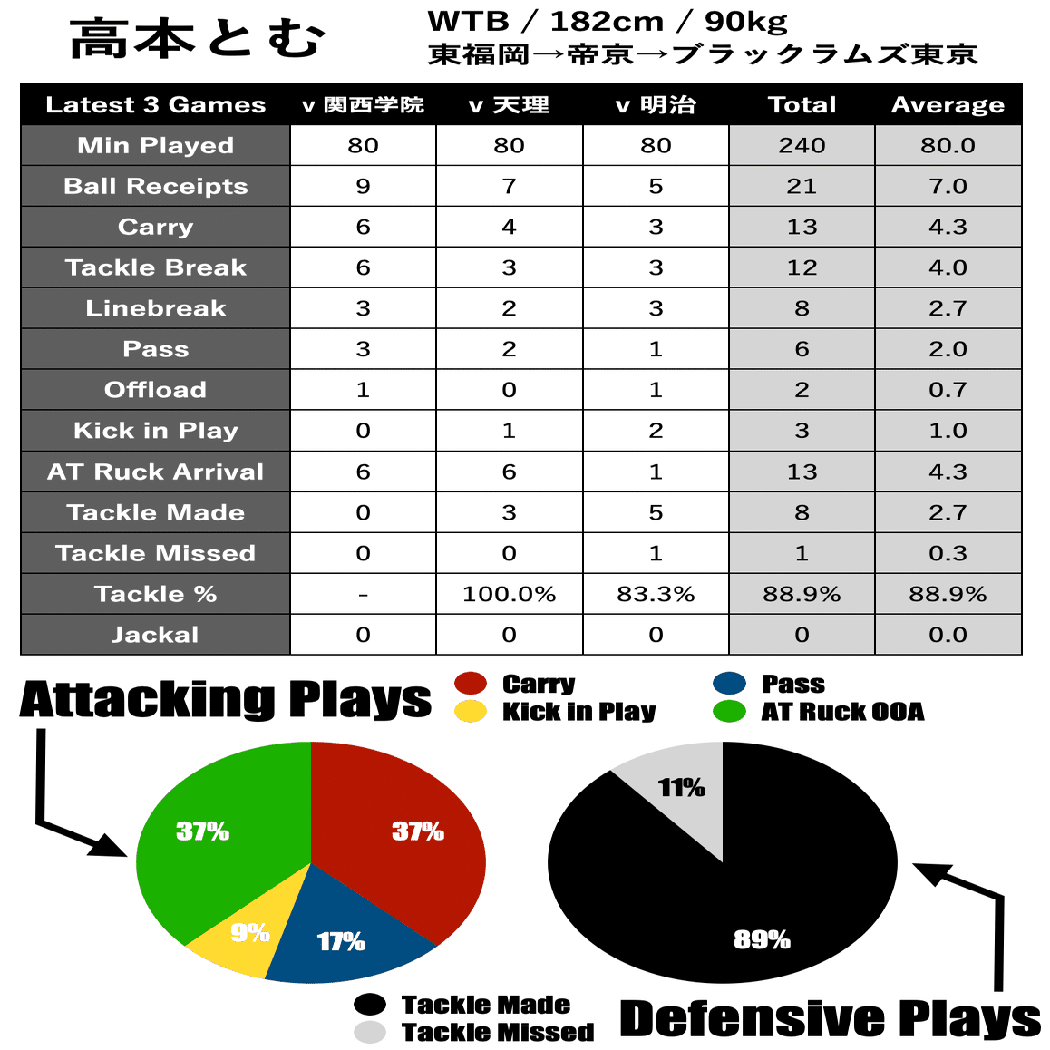アタック面で言うとボールタッチの多くがキャリーとなっている一方でHOの選手としてはパスの比率も高く、ティップパスやスイベルパスといった「自身がキャリーするように見せかけて横・後ろの選手にパスをする」のようなスキルが大学レベルでもトップのスキル水準を誇っています