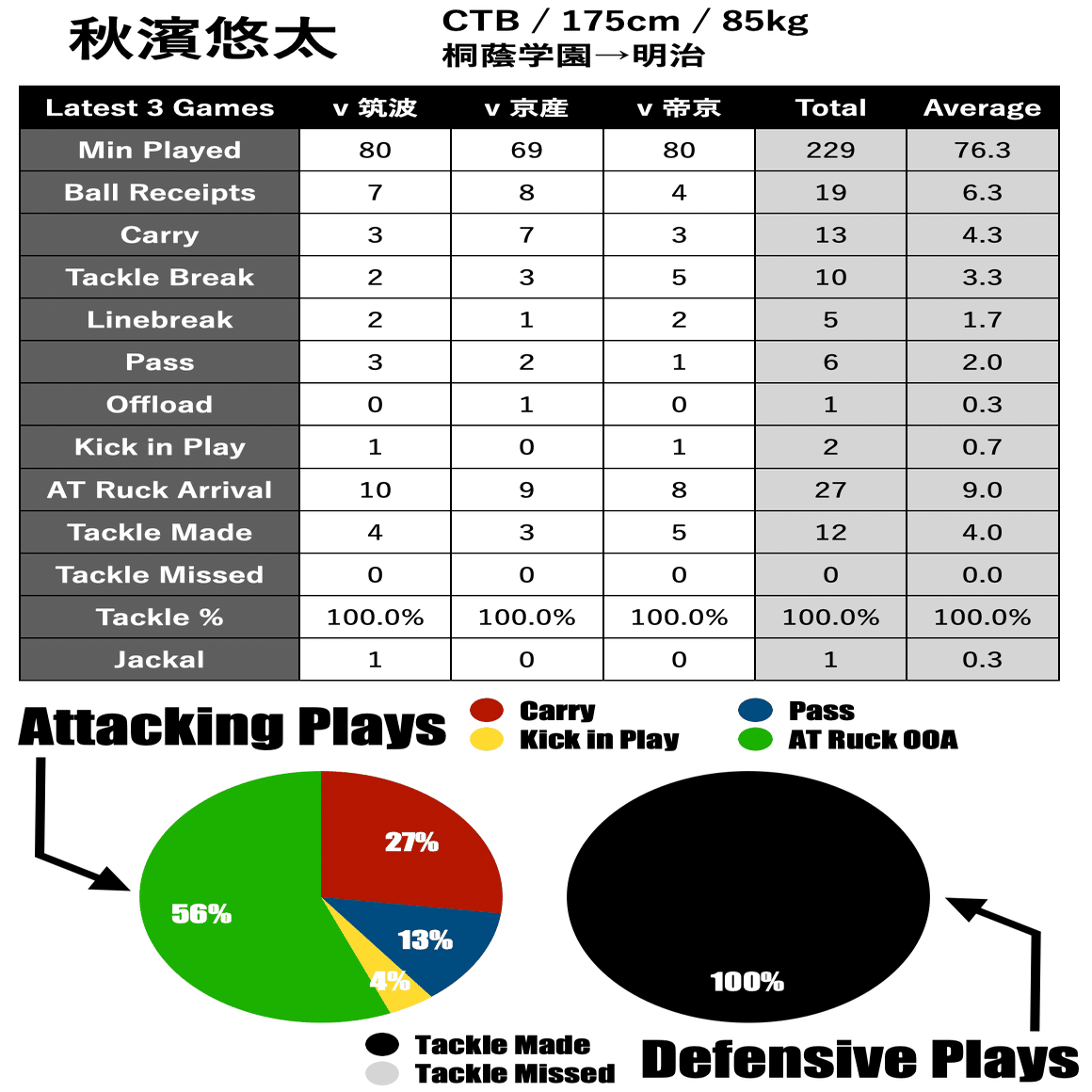 大学レベルではFWへの依存度も高く明治のアタックスタイルもあってBKのプレー参加が減る傾向にはあると思いますが、もう少しアタックにもディフェンスにも関与していきたいところではないかと思っています