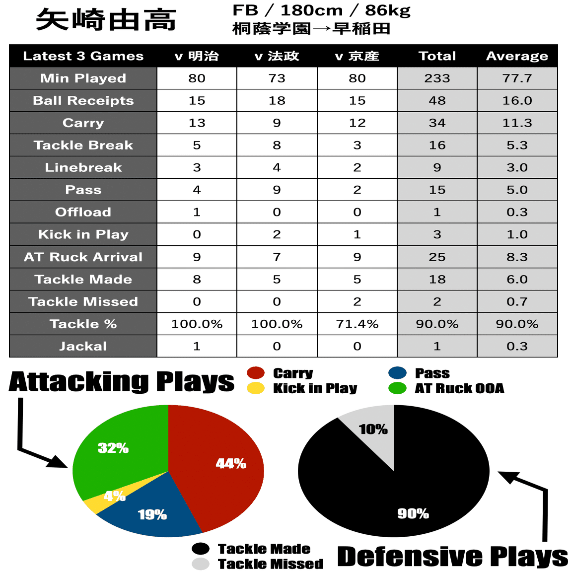 さらに早稲田には久富選手や野中選手、伊藤選手といったSO役となる選手も多いために矢崎選手がバックフィールドで対応するシーンも少なく、特にハイボールの対応はそう多くなかったのではないでしょうか